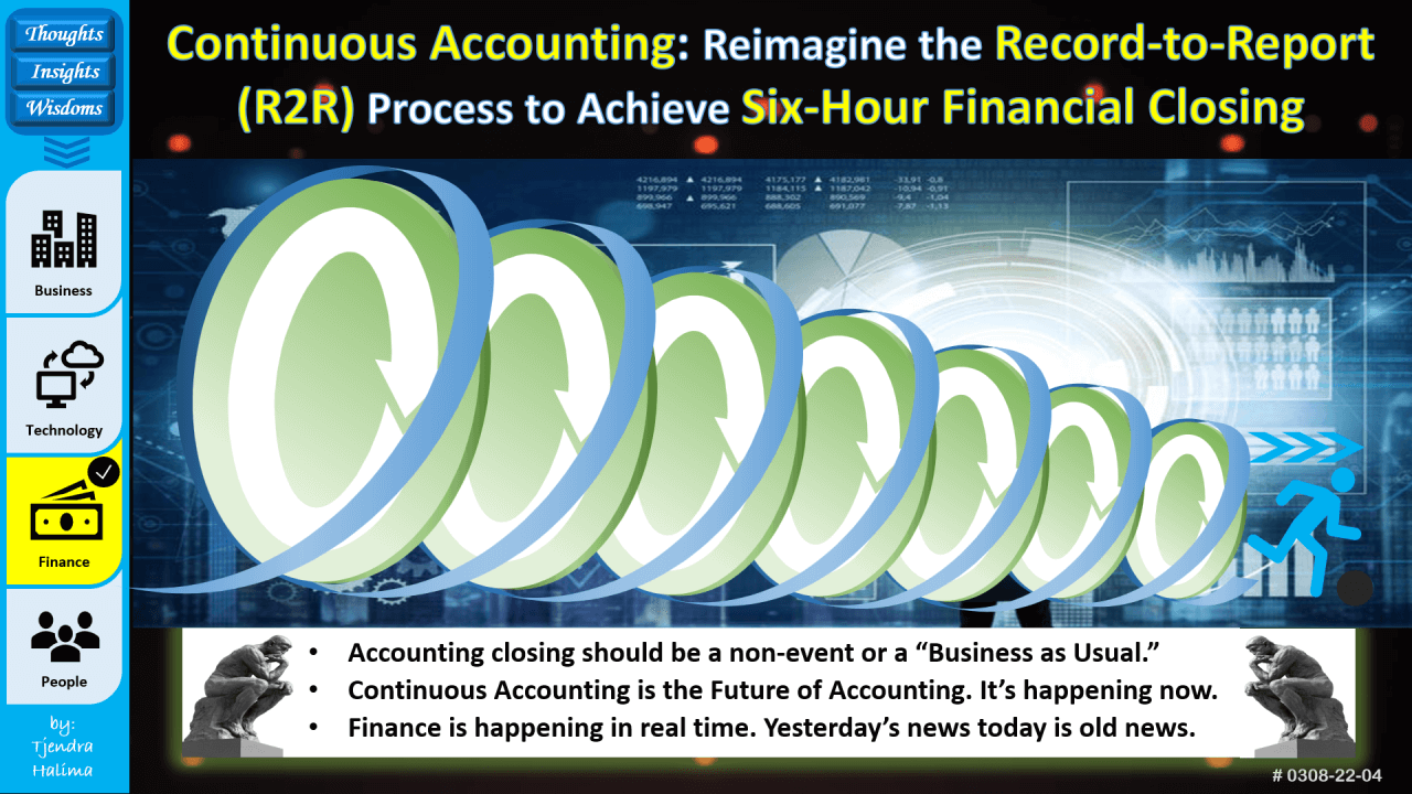 So, if your finance and accounting department still needs six days instead of six hours to close the book and publish the financial results, it is a wakeup call for the CFO (Chief Financial Officer) or the CAO (Chief Accounting Officer) to roll up their sleeves and dive deep into the closing process. It's time to raise the bar!
