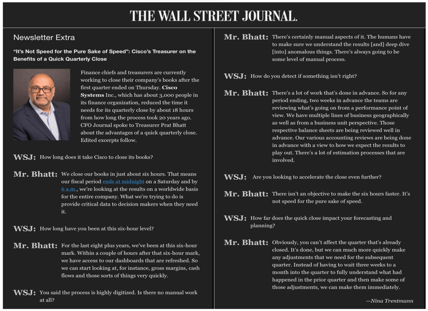 Cisco had achieved the one-day close mark for more than 20 years. Cisco’s finance organization (arguably the most efficient in the world) achieved its much-touted aim of a “virtual close.” On any given workday, the company can now produce consolidated financial statements by about 2 pm.