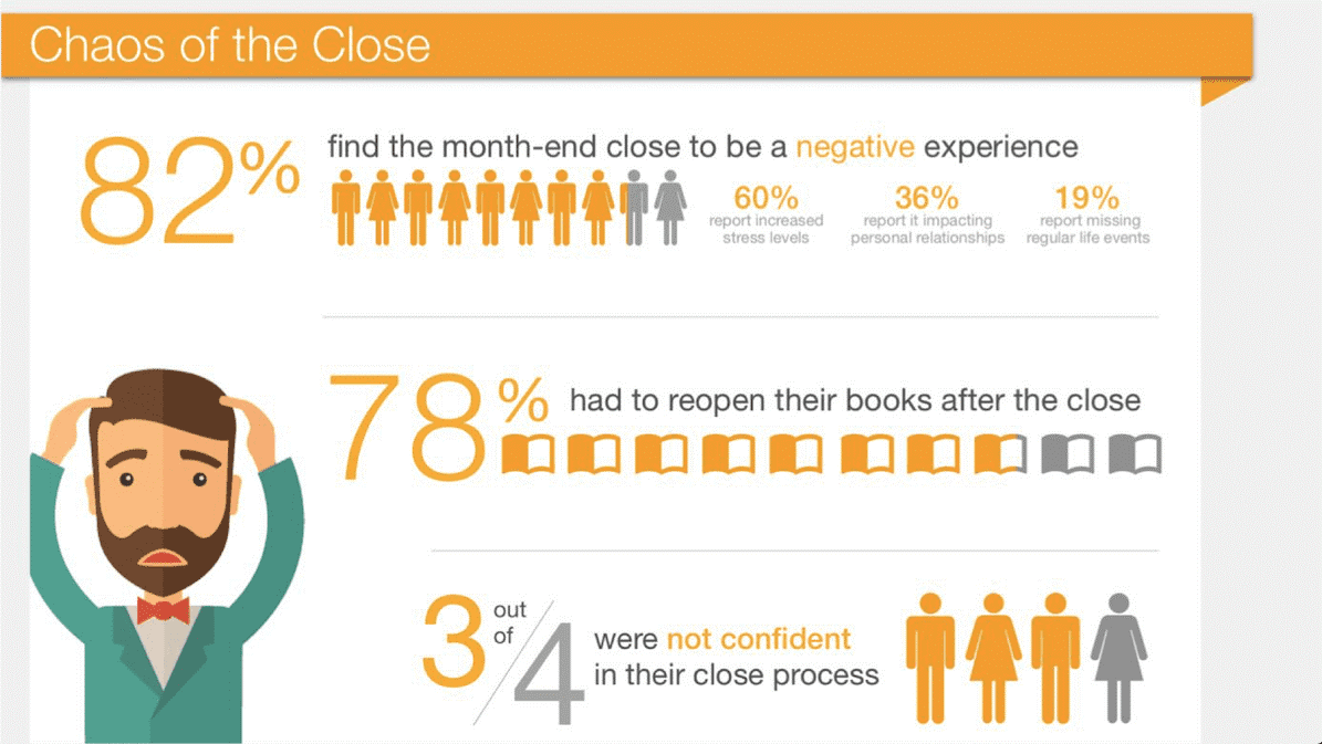 A survey done by FloQast, Inc., revealed the chaotic month-end close processes that are labor-intensive, fraught with errors, and stress-provoking for accountants and their managers. See the summary in the infographic below.