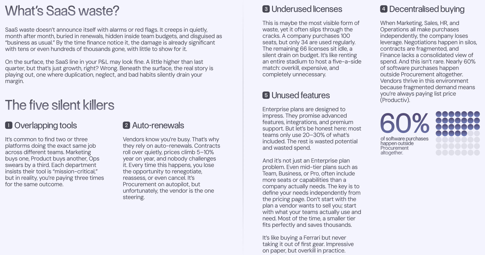 SaaS waste is what happens when growth outpaces governance, and no one has a full picture of what’s being bought, renewed, or underused.
